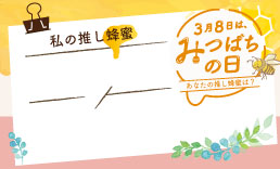 3月8日は「みつ(3)ばち(8)の日」。 全日本はちみつ協同組合と日本養蜂はちみつ協会(現:一般社団法人日本養蜂協会)が制定しました。ミツバチは、花の蜜を巣に蓄え蜂蜜を作ったり、作物の受粉にも用いられ、私たちの生活とも密接に関わっています。ミツバチが減少してしまうと人類は食糧問題の危機に直面してしまうと言われています。蜂蜜は、ミツバチやミツバチが花を訪れて蜜を採る蜜源植物などの自然が守られてこそ、食べることのできる食品です。3月8日の「みつばちの日」には、ミツバチと私たちを取り巻く世界について思いを馳せてみるのもよいかもしれません。