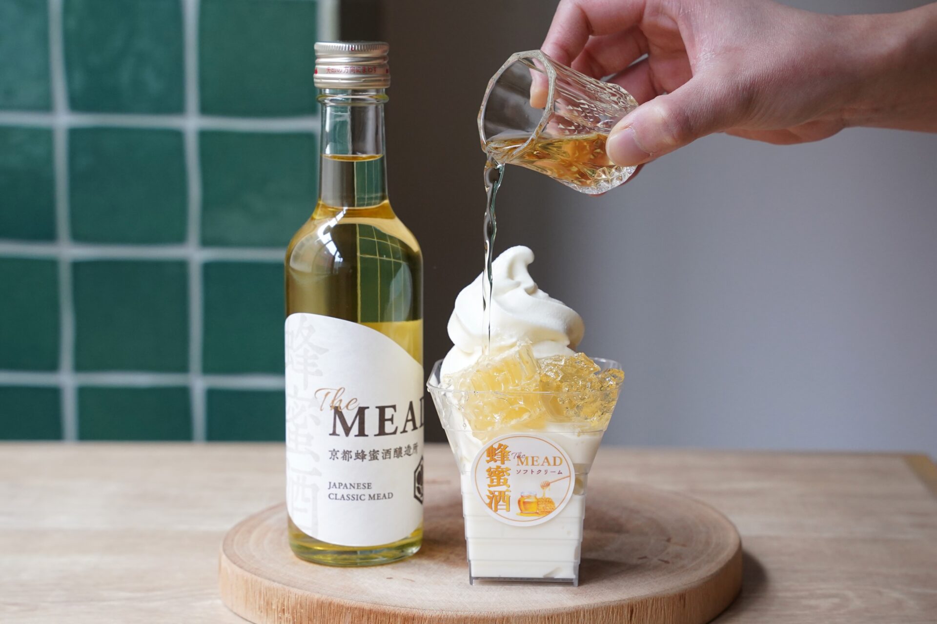 3月10日より提供する第一弾は、世界的ミードコンペティション「Mead Madness Cup Pro 2026」にてブロンズメダルを受賞した「The MEAD(ザ・ミード)」。国産百花蜜を使用し、蜂蜜本来のやわらかな甘みと花々の華やかな香りを楽しめる一本です。なめらかなソフトクリームにミードをかけ、さらにミードジュレやコームハニー(巣蜜)をトッピング。とろりとした口どけ、ぷるんとしたジュレ、そして巣蜜の食感が重なり合い、温度差とともに香りが立ち上る新感覚の“大人スイーツ”に仕上げました。