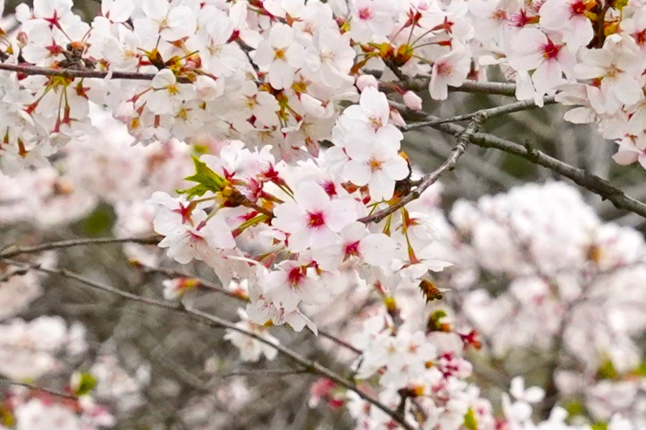 大阪府柏原市では桜が見頃を迎え、やわらかな春の空気の中、ミツバチたちが活発に花を訪れていました。